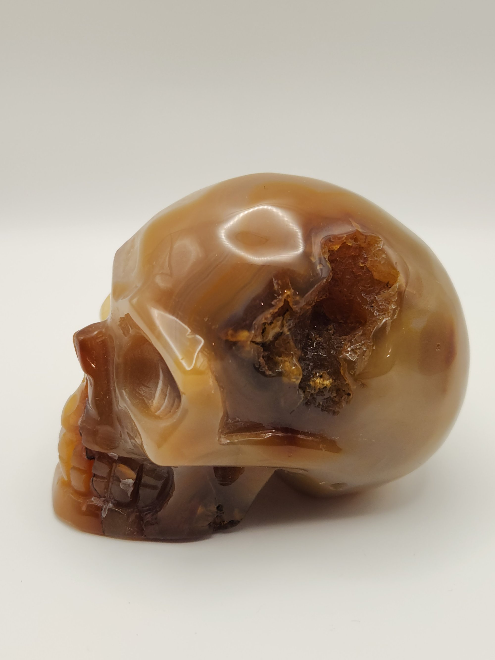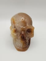 This carved druzy agate skull features warm caramel and honey tones with natural banding and a sparkling druzy pocket along the side. It weighs 18 oz and measures approximately 2.7" tall, 3.5" long, and 2.3" wide. A unique and eye-catching piece that combines polished agate with raw crystal texture perfect for display or any skull collection.