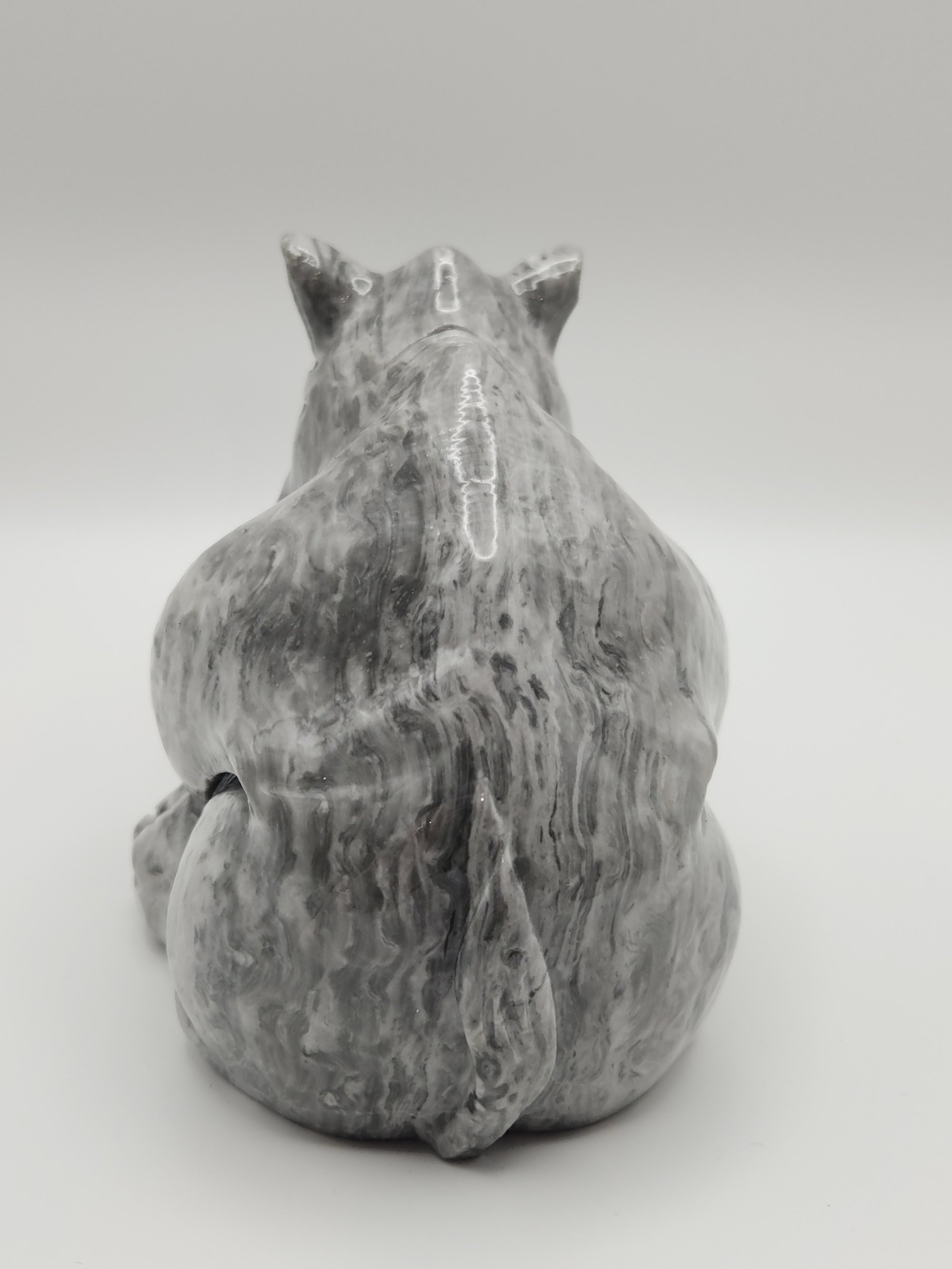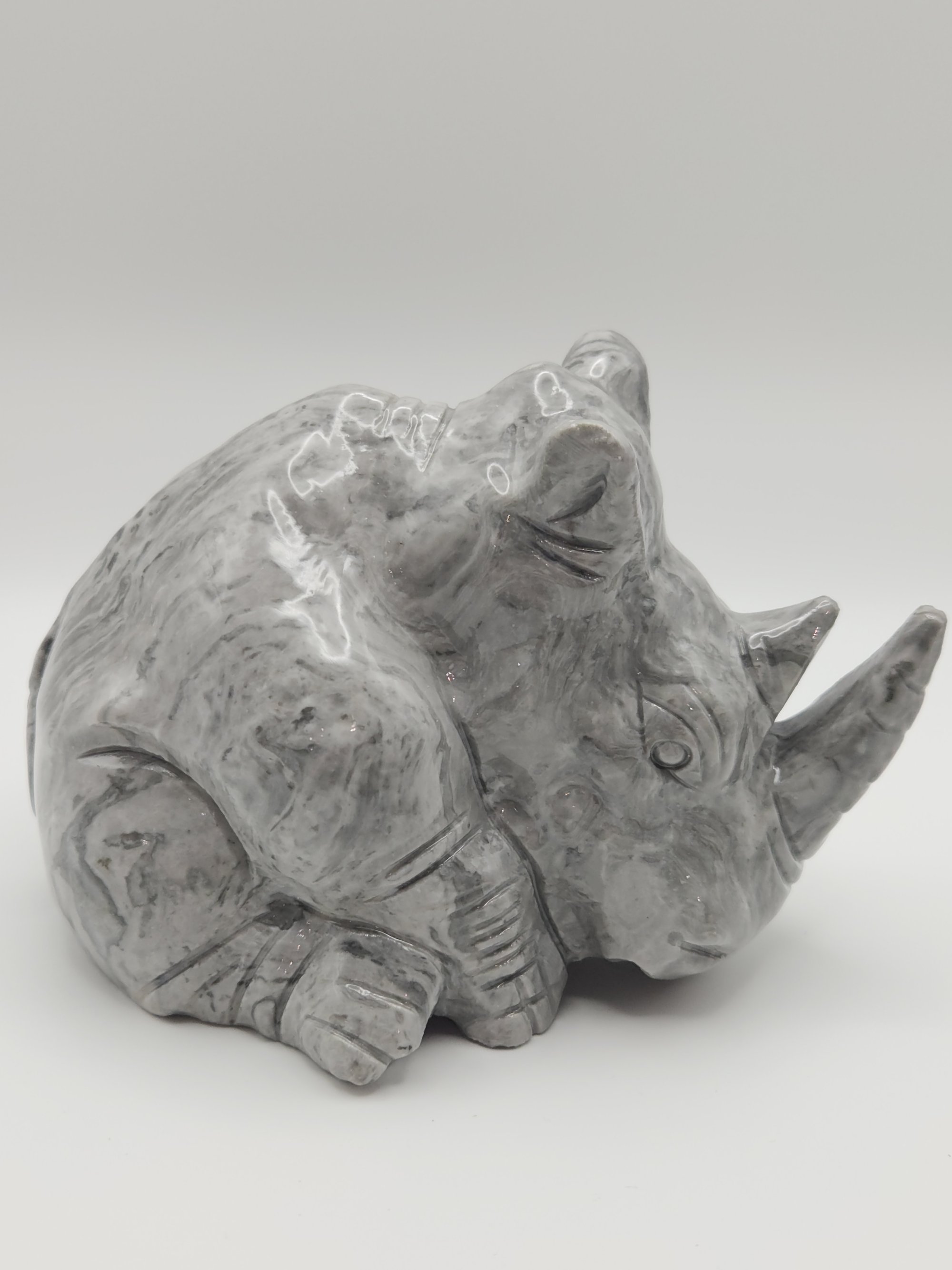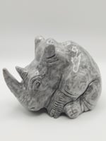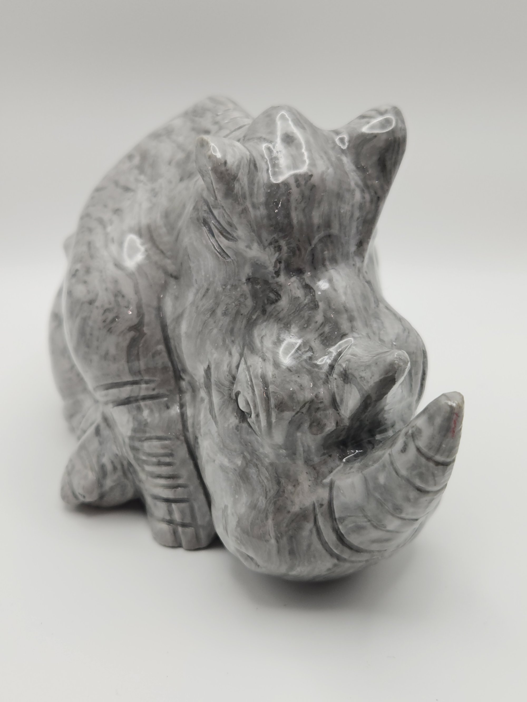 This beautifully carved Picasso Jasper rhino features striking gray, black, and white marbled patterns unique to this stone. It weighs 36 oz and measures approximately 3.7" tall, 5.0" long, and 2.9" wide. A detailed and expressive piece symbolizing protection, resilience, and grounded strength perfect for display or any carved-crystal collection.
