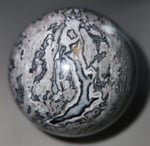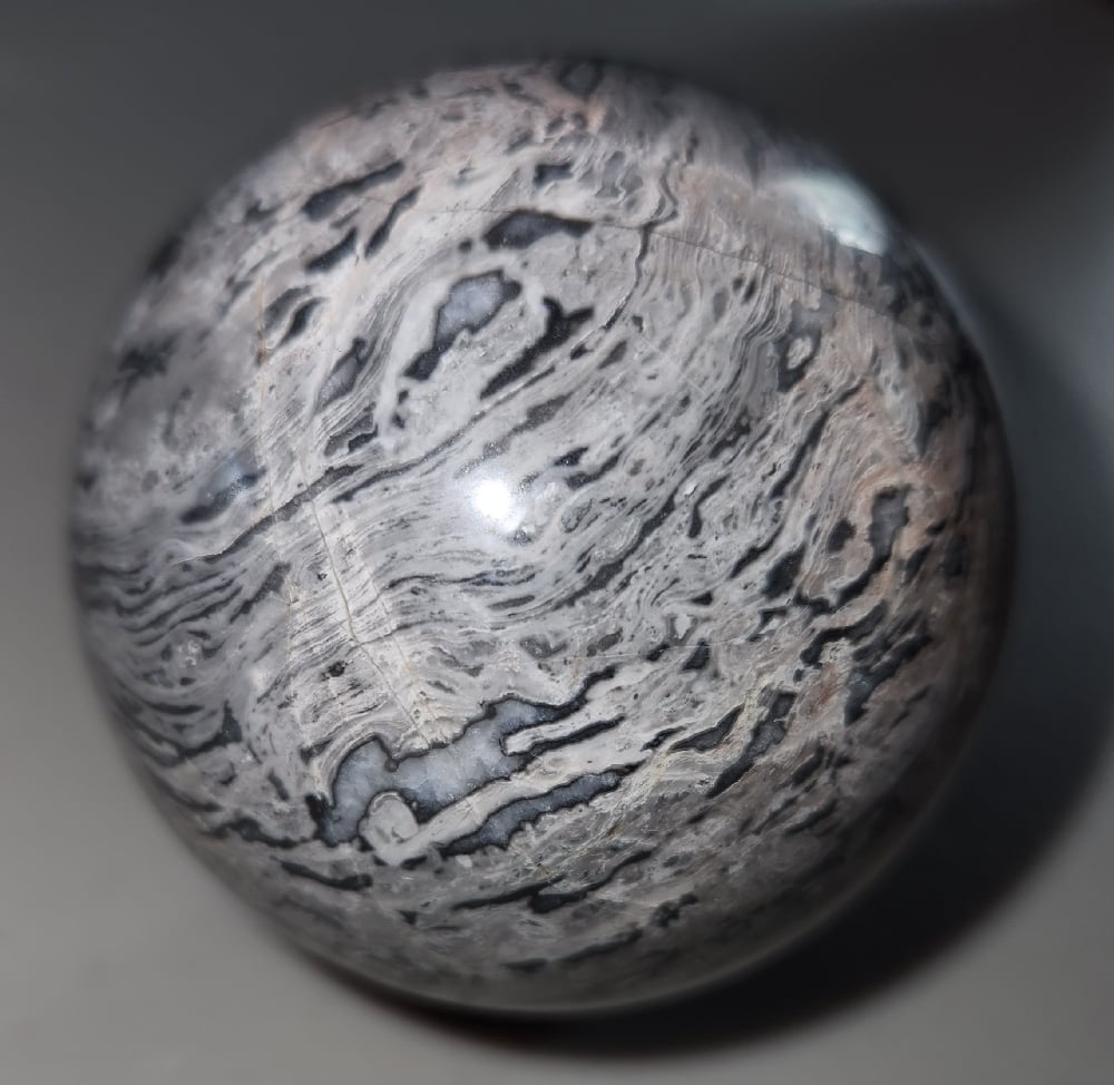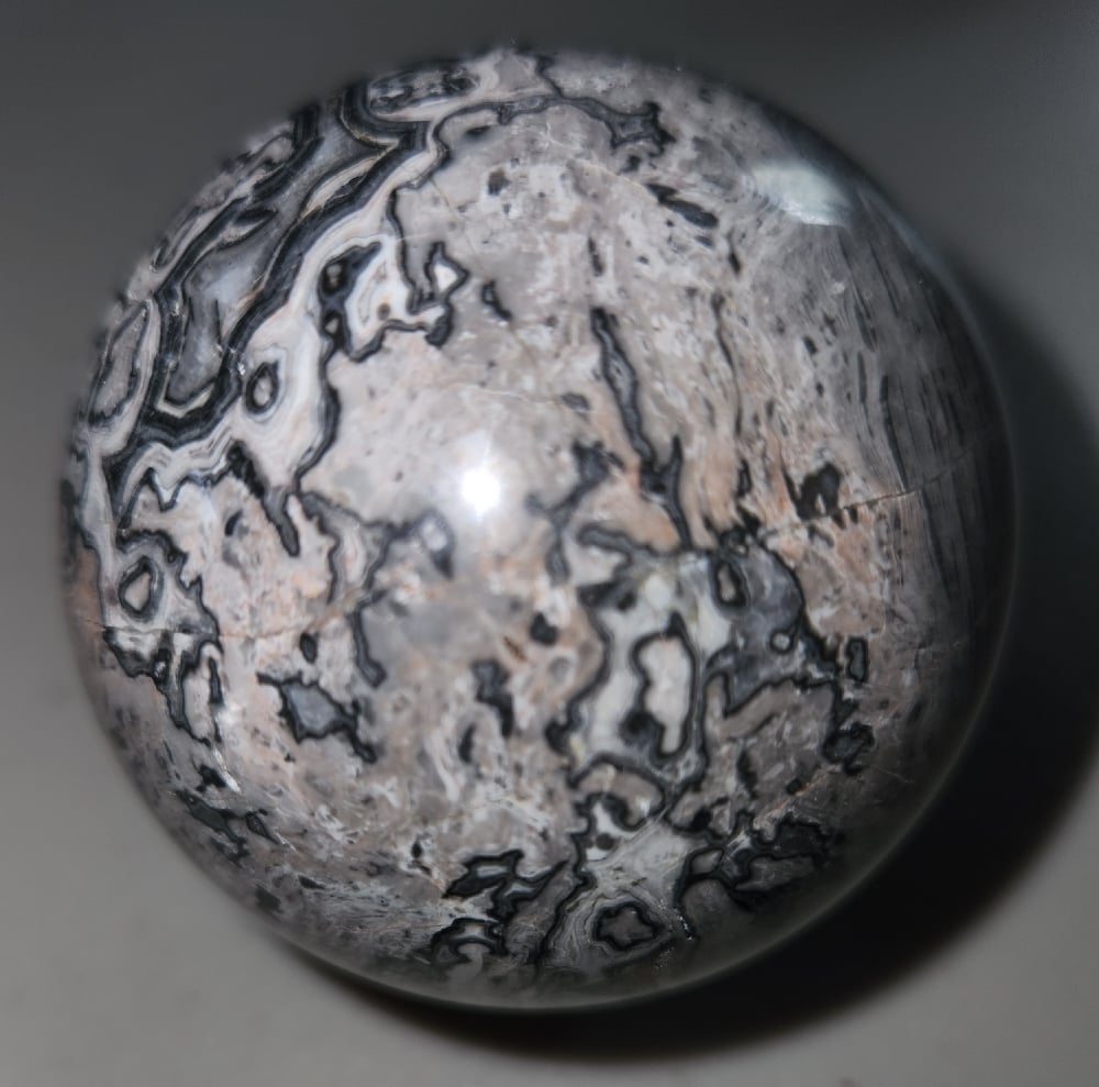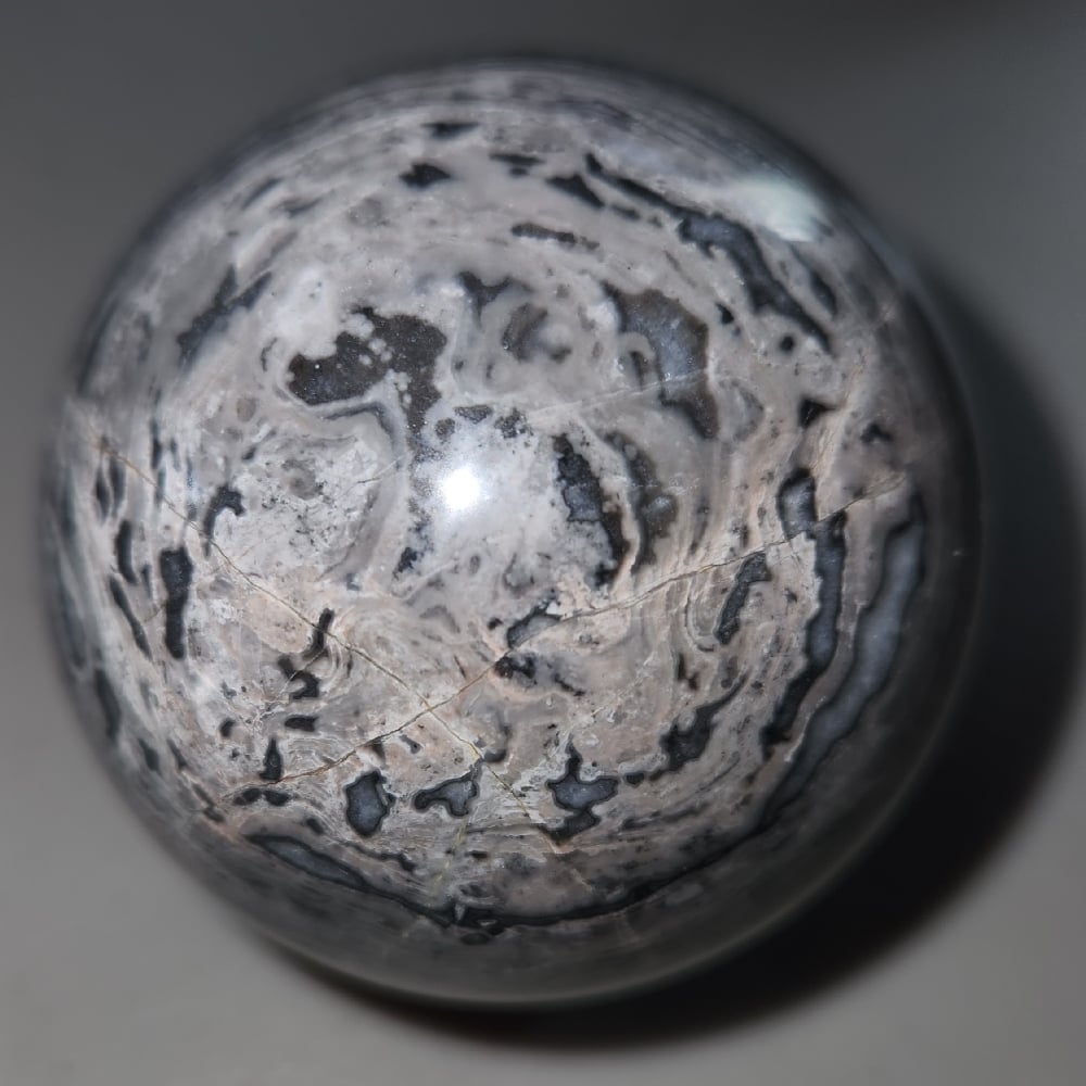 This Picasso Jasper sphere features bold, naturally occurring linework and layered patterns that look like abstract brushstrokes across stone. Its mix of charcoal black, silver-gray, and soft beige tones creates a striking marbled appearance from every angle. The sphere is hand-polished to a smooth, glossy finish, highlighting the fine details and giving it a refined, high-quality feel. This is a one of a kind piece its unique network of patterns makes it perfect for collectors, décor displays, or anyone who appreciates distinctive natural stones.