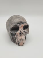 This carved pink zebra jasper skull features soft pink, gray, and black striping with a smooth polished finish. It weighs 15 oz and measures approximately 2.4" tall, 3.0" long, and 2.1" wide. A unique and grounding piece with gentle natural patterns great for display, collecting, or calming energy in any space.